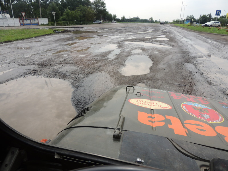 42° giorno, sabato 26 luglio Ci dirigiamo verso la Romania e, strada facendo, facciamo rifornimento (in Romania la benzina è molto più cara, ca 1,5 euro) A Solotin, l'ultimo paese in Ucraina, acquistiamo la moneta rumena (leu) perché in Romania le banche non lavorano di sabato, così ci è stato detto. I Rumeni vengono in Ucraina ad acquistare benzina che costa la metà. I distributori sono attrezzati con degli spessori di legno sui quali salgono le macchine in modo da inclinarsi e di riuscire a colmare i serbatoi. Il valico che attraversiamo è riservato soltanto alle macchine personali e ai pedoni. Impieghiamo ca. 45 minuti, compresa l'attesa in coda. Subito dopo il confine entriamo in una bella città. Al primo distributore acquistiamo la vignetta al costo di 3 euro per 7 giorni e una carta stradale visto che quella che ci avevano regalato Tonci e Iris è rimasta a casa (non pensavamo che ci potesse servire). Proseguiamo per 120 km fino alla città Vatra Dormei e per arrivarci superiamo un passo a 1400 m d'altezza. La forte pioggia non ci permette di godere appieno della bellezza del paesaggio ricco di distese boschive. A Vatra Dormei troviamo un campeggio e ci fermiamo per pernottare. . . . 41st Day, Friday, July 25 We're headed towards Romania, towards the border crossing near the town of Cervinci. The road to the border is blocked by barricades. Since yesterday evening nobody passes. There is not even the army or the police, there is no one there. Some people indicate to us a country road, but even that one is blocked after 4 km by a large tree. We also try a third alternative by taking a rough road that leads to a small monastery, but we can't pass. We return to the town (here no one knows what's going on) and we head north for 60 km and then west for another 50 km and arrive in a large tourist resort full of hotels and spend the night there. We hope to get to Romania tomorrow. Values of the day: 404 km 42nd Day, Saturday, July 26 We head towards Romania and, along the way, we buy petrol (in Romania it is much more expensive, about € 1.5). In Solotin, the last village in Ukraine, we buy the Romanian currency (leu) because the banks in Romania do not work on Saturdays, so we were told. The Romanians come to Ukraine to buy gasoline that costs half as much. The petrol stations are equipped with the wooden shims on which they climb their cars so as to incline them and be able to fill completely the tanks. We cross the border pass that is reserved only for personal cars and pedestrians. We spend there approx. 45 minutes, including the wait in the queue. Immediately after the border we enter a beautiful city. On the first petrol station we buy the vignette at price of 3 Euros for 7 days and a road map because the one we received from Tonci and Iris remained at home (we didn't plan to come here). The road takes us to the pass at 1400 m. The heavy rain doesn't allow us to fully enjoy the beauty of the landscape rich on forest. 120 km after the border we get to the city of Vatra Dormei where we find a campsite and stop for the night.