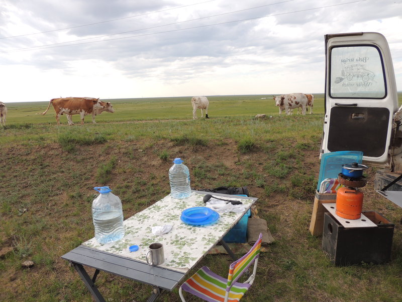 Giorno 34 Parto, oggi farò pochi chilometri. Arrivo al confine mongolo. Il valico è piccolissimo. C’è un furgone davanti a me. Sono le 10, passo il confine mongolo alle 10.45. 100 m più in là c’è il confine russo. Qui passa anche la ferrovia, ci sono i ponti di controllo, riflettori, rete e colonne (da ambo i lati). Trovo di nuovo davanti quel furgone e una macchina; un’altra è già nella zona tra le due sbarre. Arriva un’altra auto dietro di me. Credo che qui non passino più di 10 veicoli al giorno. Entro nella zona tra le sbarre alle 14.00 ed esco alle 16.00. In tutto 6 ore. Aggiungo anche 1 ora sull’orologio, sono nel fuso orario +7 ore rispetto alla Croazia. Chiedo alla polizia dove posso pernottare lungo la strada. Mi dicono dopo la tabella con la scritta “zona di confine” a 5 km di distanza. 2 km più avanti c’è il villaggio di Solovjetsk e poco dopo la tabella. Normalmente in Russia non dormo mai fuori dalla zona dedicata, ma qui sono in un’area poco frequentata. Passano poche macchine dirette nel paese o al confine. Mi fermo accanto alla tabella a 2 metri dalla strada. Non c’è nessuno, soltanto un centinaio di mucche lì vicino. Mi preparo per la cena. Nel mentre arriva un poliziotto in borghese e molto gentilmente mi spiega che non posso rimanere lì. Devo allontanarmi di almeno 35 km. Così ho fatto. Ho raggiunto un altro paese e mi sono fermato in mezzo ai prati. Oggi ho percorso 110 km. Ho aperto il mio quaderno; in Mongolia ho percorso 4650 km di cui soltanto 450 – 500 km su asfalto.