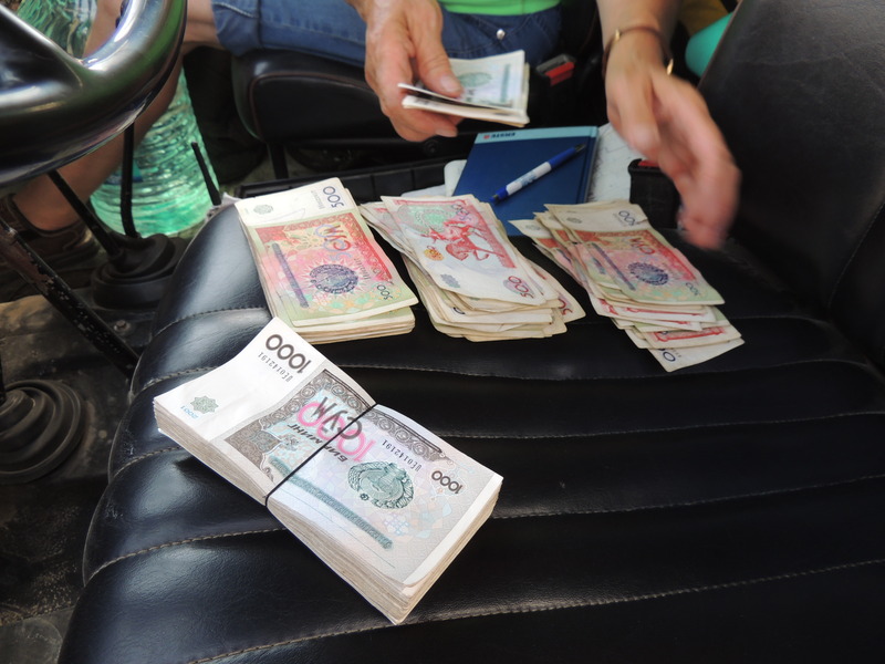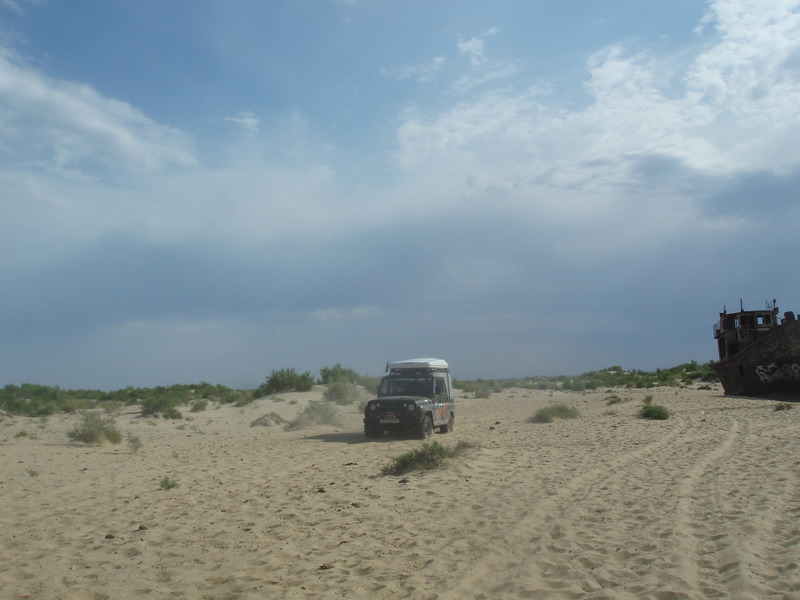 Pamir 2014-11.danUjutro kreæemo za Moynak,gradiæ na nekadašnjoj obali Aralskog mora,sada daleko od njega više od 50 km,zato jer su Sovjeti od 60 tih do 90 ih godina isušili ogromne kolièine tog mora i preokrenuli ih za navodnjavanja polja pamuka.Tu se nalazi i groblje ribarskih brodova,koji su onda svi bili ostali bez posla. U povratku punimo benzin u jednoj lokalnoj konobi,pa gas prema Khivi,starom poznatom gradu na nekadašnjem putu svile.Više o tome možete proèitati na Wikipedii.Grad je pod zaštitom Unesco-a. U svim krajevima do sada,gdje smo prolazili,troši se flaširana voda za piæe,tako imaju pakovanja i od 10 pa i 12 litara kao na slici. Danas je temperatura dosegla paklenih +44C,u Uazu je temperatura vode konstantno oko 90-95 C (inaèe 75-max 80 C).Nas dvoje danas smo popili 9 litara vode. Na jednoj od slika vidi se puno novèanica,cijela hrpa toga na sjedištu vrijedi oko cca 53 Usdolara. Na ostalim slikama vidi se i veèera u Hotelu "Alibek",tipièno uzbeèko jelo plov (riža,meso i dodaci,vrlo ukusno)i sa svakim obrokom pije se èaj.